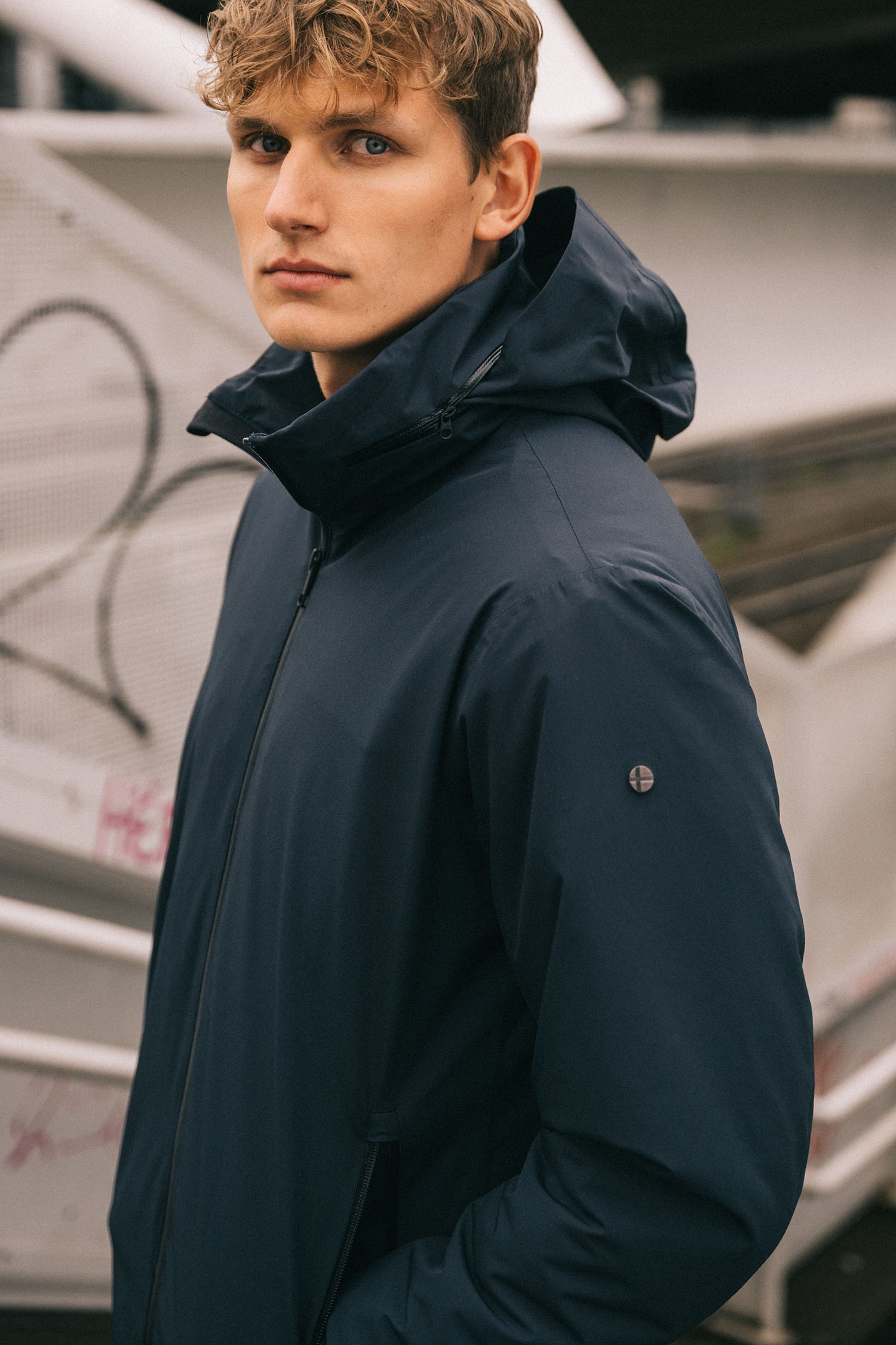 - Packable hood in collar, closing with two zipper pullers on a reversed Coil Aquaguard zipper