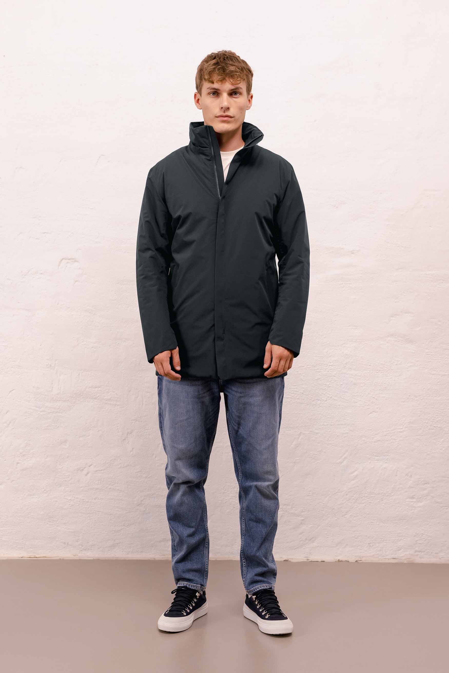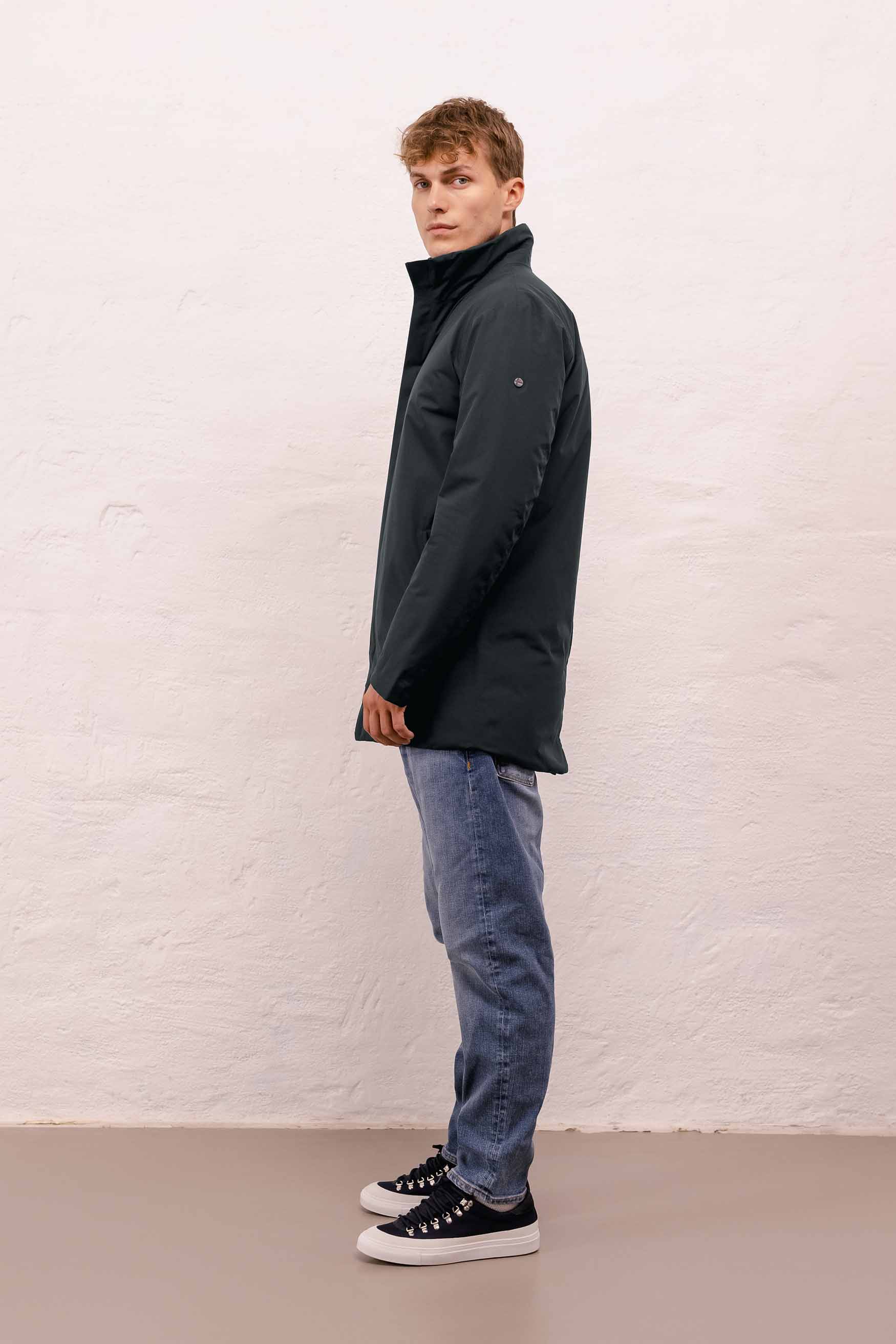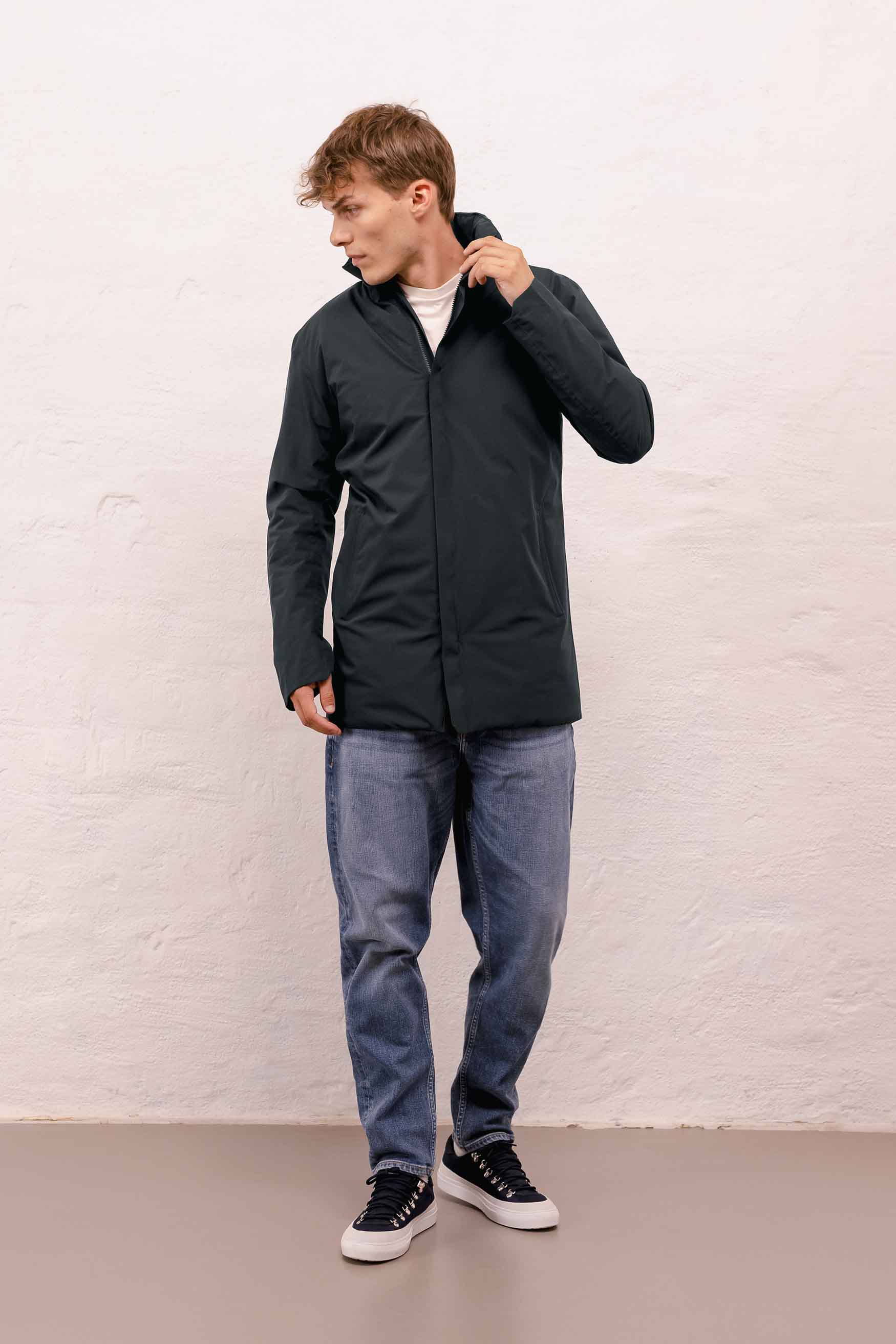 Town is a Fitted coat, meaning that it is designed to follow the body's natural lines without tapering. Fitted is a versatile shape that feels slightly narrower than a regular fit but with more room than a slim fit.